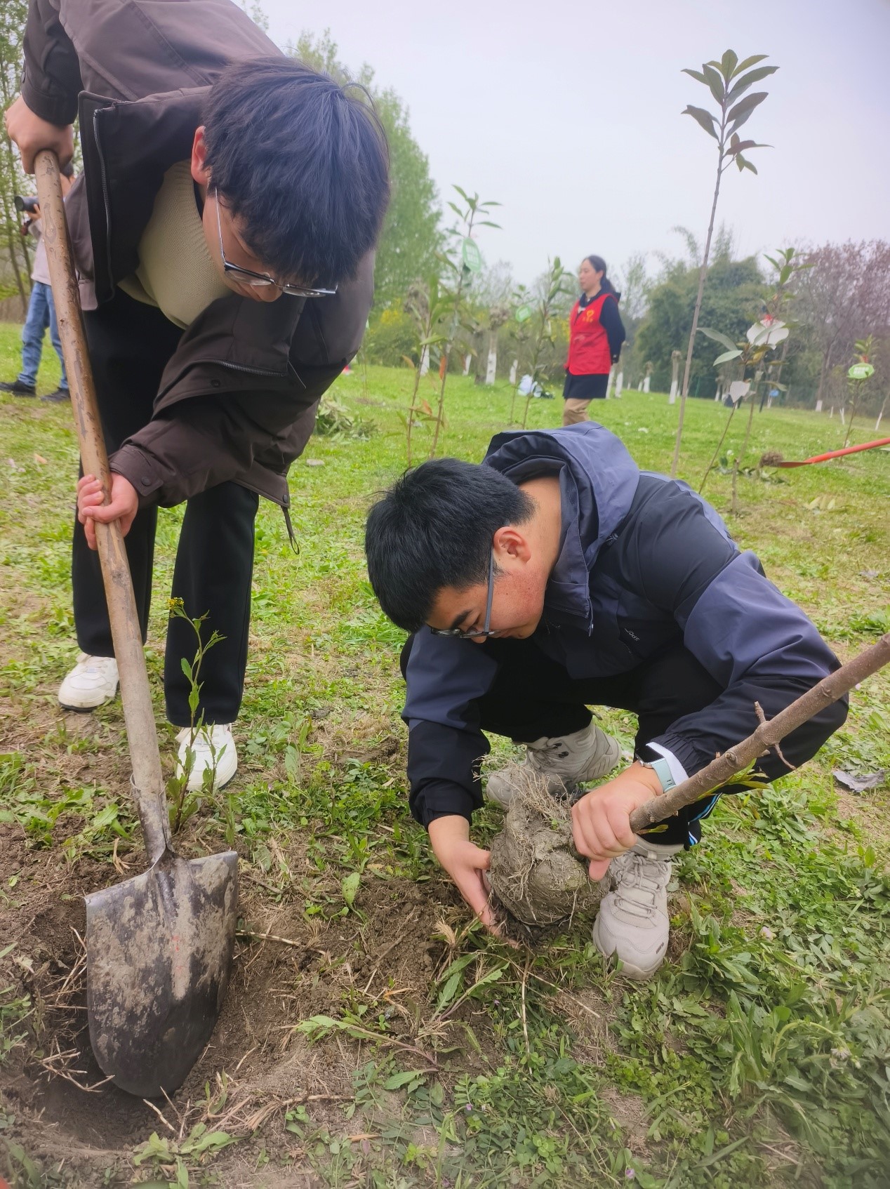 15:00,同学们前往东林艺术村,开展植树造林实践,用双手为家园增添一抹青绿。在现场,大家领取树苗、铁锹和水桶,在工作人员的指导下,分工协作、有条不紊——挥锹铲土、扶苗填坑、踩实浇水,每一个环节都做得认真细致、一丝不苟。春日的暖阳下,同学们挽起衣袖、挥洒汗水,欢声笑语间,一株株小树苗被稳稳栽种在泥土中,迎风挺立,承载着大家对绿色家园的美好期盼。